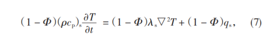 兩種能量增加帶來的溫升是基于多孔介質(zhì)材料內(nèi)的固體部分。假設(shè)固體部分的密度表示為ρs,其比熱容表示為cs。假定研究對象熱物性參數(shù),如比熱容、導(dǎo)熱系數(shù)等,不受到時間和空間改變帶來的影響,多孔介質(zhì)本身始終為各項(xiàng)同性的,并且多孔介質(zhì)材料內(nèi)部細(xì)小孔隙的容積均被流體填充,則有: