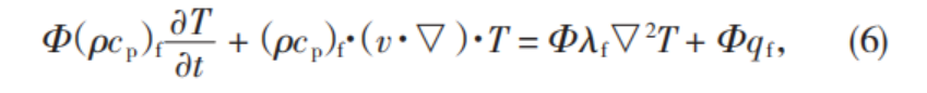 式(6)—式(7)中,ρ為密度,kg/m3;cp為比熱容,J(/kg·K);(ρcp)f為多孔介質(zhì)流相中總的體積比熱容,J/m3;T為溫度,K;t為時間,s;λf為液體導(dǎo)熱系數(shù),W(/m·K);qf為液體內(nèi)熱源強(qiáng)度,W;(ρcp)s為多孔介質(zhì)固相中總的體積比熱容,J/m3。將式(6)與式(7)相加,可導(dǎo)出單相流體的多孔介質(zhì)的能量方程為: