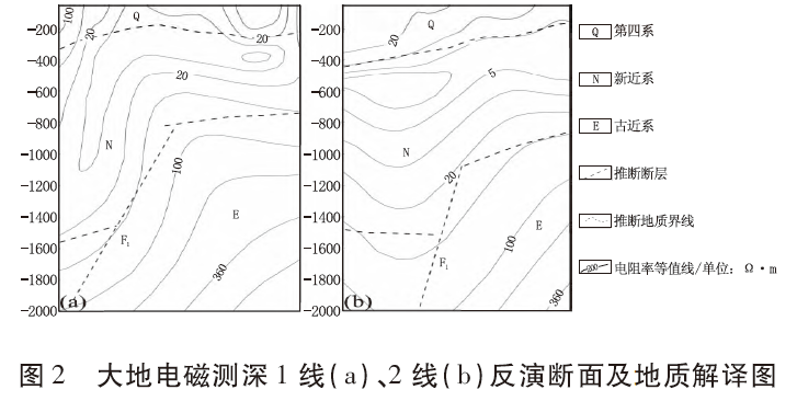 勘查區(qū)內(nèi)主要斷裂構(gòu)造均為區(qū)域性斷裂的次生斷裂,主要有NNE向張完集斷裂F1和EW 向的渦河斷裂F推1(圖1)。前人在區(qū)內(nèi)布設(shè)有兩條大地電磁測深平行剖面(1線、2線),通過明顯的“V”型寬大低阻異常和同步向下彎曲典型斷裂異常特征,于區(qū)內(nèi)東側(cè)邊界解譯推斷了走向約40°、NWW 傾的張完集斷裂F1(圖2)。渦河斷裂F推1位于勘查區(qū)南側(cè)亞珠石油城—化肥廠一線,該斷裂為亳州隆起的北界斷裂,其主要通過重力資料推測為EW 走向、N傾的正斷層。