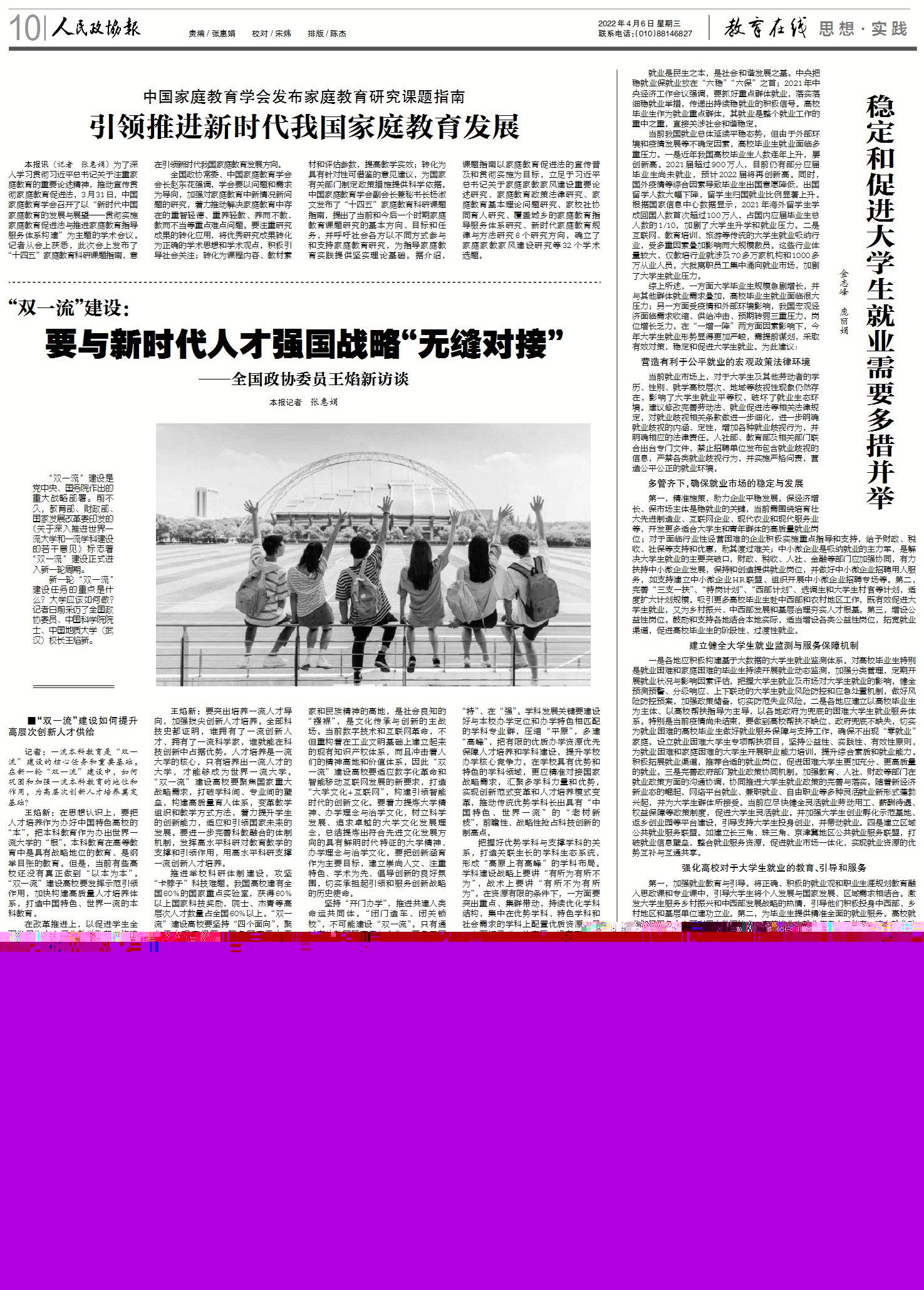 王焰新:要突出培養(yǎng)一流人才導向,加強拔尖創(chuàng)新人才培養(yǎng)。全部科技史都證明,誰擁有了一流創(chuàng)新人才、擁有了一流科學家,誰就能在科技創(chuàng)新中占據(jù)優(yōu)勢。人才培養(yǎng)是一流大學的核心,只有培養(yǎng)出一流人才的大學,才能夠成為世界一流大學?!半p一流”建設高校要聚焦國家重大戰(zhàn)略需求,打破學科間、專業(yè)間的壁壘,構建高質量育人體系,變革教學組織和教學方式方法,著力提升學生的創(chuàng)新能力,適應和引領國家未來的發(fā)展。要進一步完善科教融合的體制機制,發(fā)揮高水平科研對教育教學的支撐和引領作用,用高水平科研支撐一流創(chuàng)新人才培養(yǎng)。