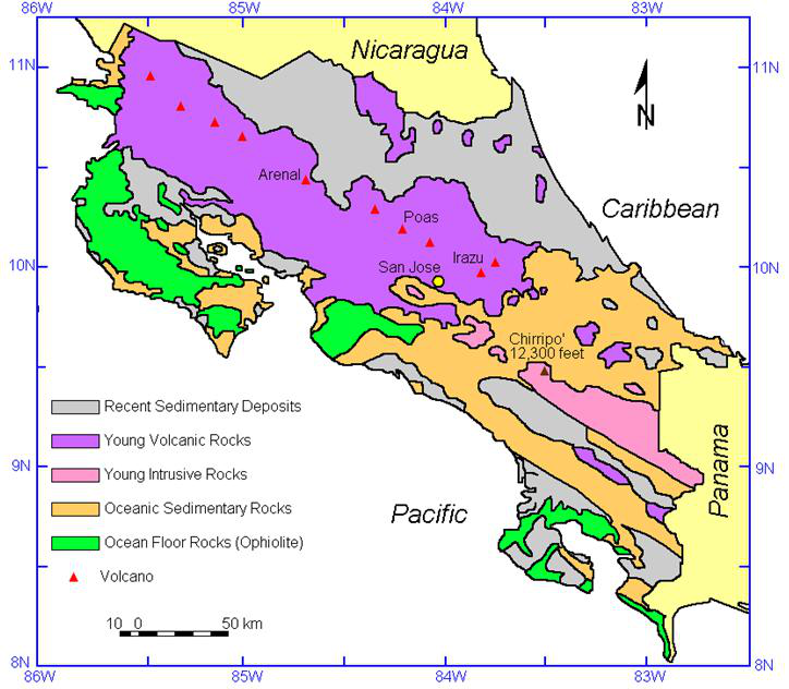 哥斯達黎加位于中美洲地峽,屬于北美洲,北緯10°,西經84°。東臨加勒比海西靠北太平洋,有著1290千米有著1290千米的海岸線(東岸加勒比海212千米,西岸太平洋1016千米)。哥斯達黎加北部與尼加拉瓜接壤(邊境線長309千米),東南偏南與巴拿馬接壤(邊境線長639千米)??偣灿?1100平方公里,其中領土50660平方公里,領海440平方公里,比美國的西弗吉尼亞州稍小,相當于愛爾蘭。森林覆蓋率為51%。哥斯達黎加的地形是:海岸邊是平原,而中部被崎嶇的高山所隔絕。該國宣布其專屬經濟區(qū)為200海里,領海為12海里。氣候屬于熱帶和亞熱帶,還有一部分是新熱帶。