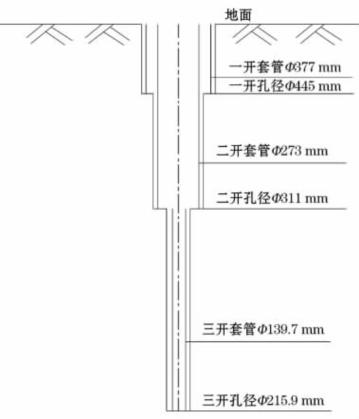 如圖所示,該孔采用三開結(jié)構(gòu),一開0~30m,井徑為445mm;二開30~500m,井徑311mm;三開500~350 m,井徑215.9mm。0~ 30m下入Φ377mm護(hù)壁管;0~500m下入Φ273mm套管作為出水管及泵室管;500~3500m下入Φ139.7mm套管作為出水管及濾水管。