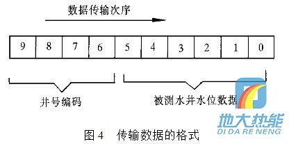 現(xiàn)在通過單片機(jī)輸出控制一組由三極管組成的電子開關(guān),由電子開關(guān)代替按鍵功能完成數(shù)據(jù)輸入.例如:要傳輸十進(jìn)制數(shù)據(jù)0,1,2,3,4,5,6,7,8,9,單片機(jī)依次輸出接通雙音頻編碼器輸入數(shù)字按鍵0,1,2,3,4,5,6,7,8,9對圖4 傳輸數(shù)據(jù)的格式應(yīng)的電子開關(guān)的控制信號,則該組數(shù)據(jù)經(jīng)雙音多頻編碼器轉(zhuǎn)換為雙音頻信號. 雙音多頻編碼器在單片機(jī)控制下,定時“撥通”水位監(jiān)測中心電話號碼,在水位監(jiān)測中心計(jì)算機(jī)應(yīng)答并“摘機(jī)”的情況下,通過這條已接通的電話線路,將所測的水位數(shù)據(jù),經(jīng) 過雙音多頻編碼器編碼后傳送到監(jiān)控中心. 要傳輸?shù)臄?shù)據(jù)格式為:數(shù)據(jù)長度為10位十進(jìn)制數(shù),其中高四位為井號編碼,低六位為所測量的水井水位數(shù)據(jù),水位數(shù)據(jù)分整數(shù)和小數(shù)兩部分.數(shù)據(jù)傳輸?shù)姆较蚴菑母呶坏降孜?數(shù)據(jù)格式如圖4所示.